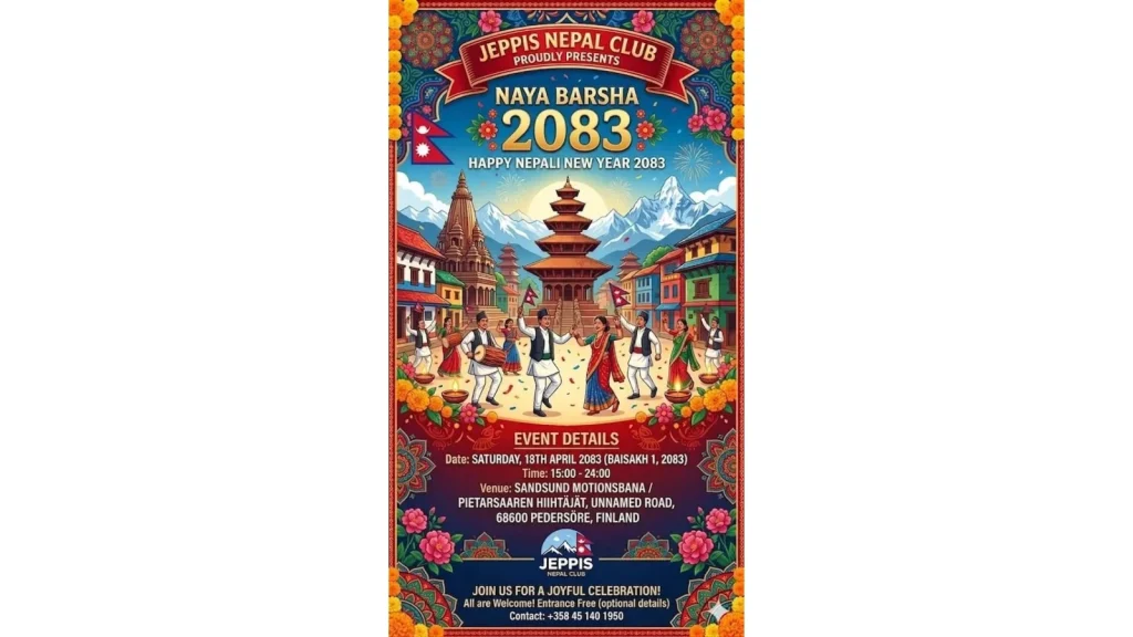 Jeppis Nepal Club is getting ready for an exciting celebration to welcome Nepali New Year 2082. This Nepali New Year celebration will be held in Jakobstad , Finland for friends who have been living far from their families and loved ones. The gathering is designed to bring warmth, connection, and a sense of home to everyone attending. Guests will enjoy light snacks and a relaxed grill session, creating a cozy atmosphere perfect for conversation and togetherness. The evening will conclude with heartfelt New Year greetings and well‑wishes, allowing everyone to welcome the new year with positivity, community, and shared joy.
