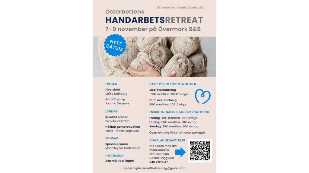Närpesnejdens Marthaförening bjuder in dig till en avkopplande MarthaWeekend på mysiga Övermark Bed & Breakfast fredag till söndag, den 7–9 november. Vi erbjuder ett lugnt veckoslut med handarbete, god mat, program och trevligt sällskap i en lugn och naturskön miljö. Temat för helgen är ”ullens väg från får till socka” och det ordnas en rad olika workshops kring temat. Men du behöver inte vara handarbetsintresserad för att trivas. Helgen erbjuder något för alla och envar.
