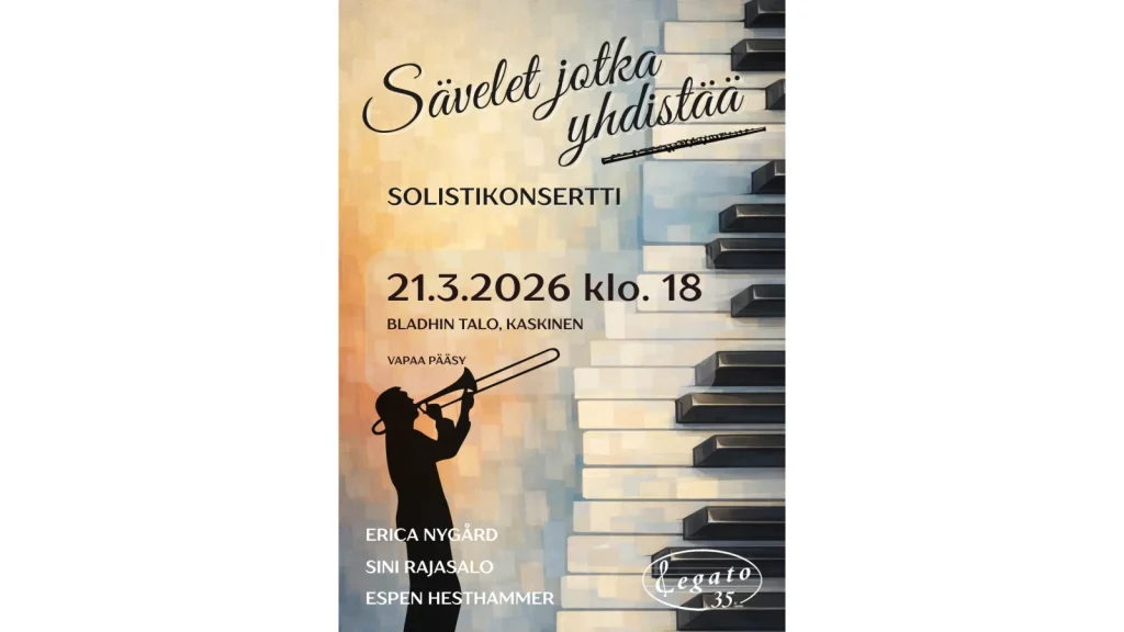 Tule kuuntelemaan kolmea upeaa solistia, jotka olivat Legaton oppilaita monta vuotta sitten ja joiden intohimo ja ammatti on musiikki tänä päivänä. Erica Nygård, Sini Rajasalo ja Espen Hesthammer tarjoavat sävelet jotka yhdistää.