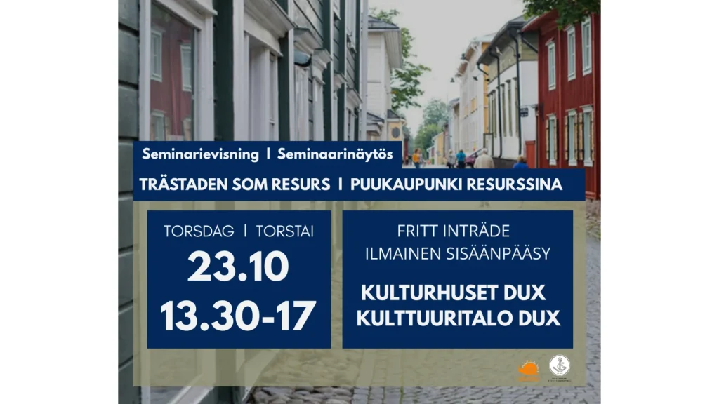 Tervetuloa inspiroivaan iltapäivään Kulttuuritalo Duxiin, jossa näytämme verkossa järjestettävän seminaarin Puukaupunki resurssina Nordiskt Treby -verkostolta – suoraan valkokankaalla!