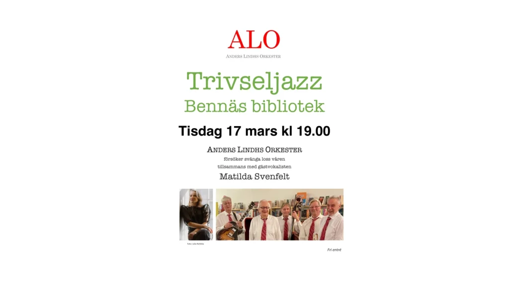 Anders Lindhs Orkester – ALO – svänger loss bland bokhyllorna på Bennäs bibliotek tisdagen den 17 mars kl 19.00.