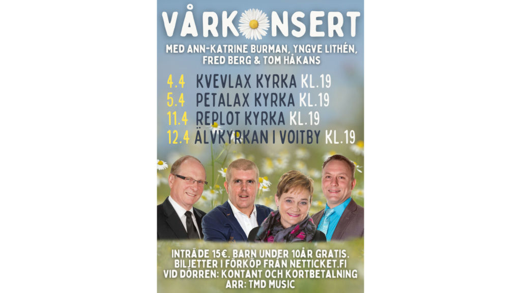 Välkommen in i värmen och gemenskapen på en stämningsfull och mysig vårkonsert i kyrkomiljö, som innehåller allt vad beträffar repertoar och olika musikstilar med fyra av Svenskfinlands mest folkkära artister!